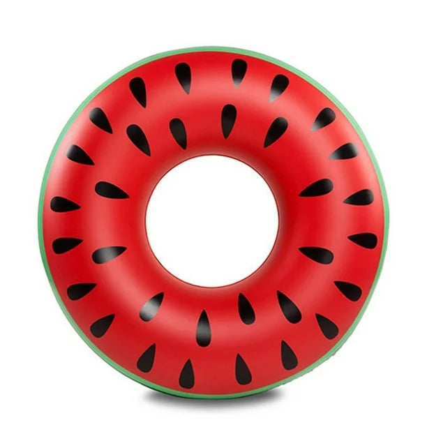 A bright, inflatable watermelon swimming ring perfect for lounging, playing, and making a splash at the pool or beach.